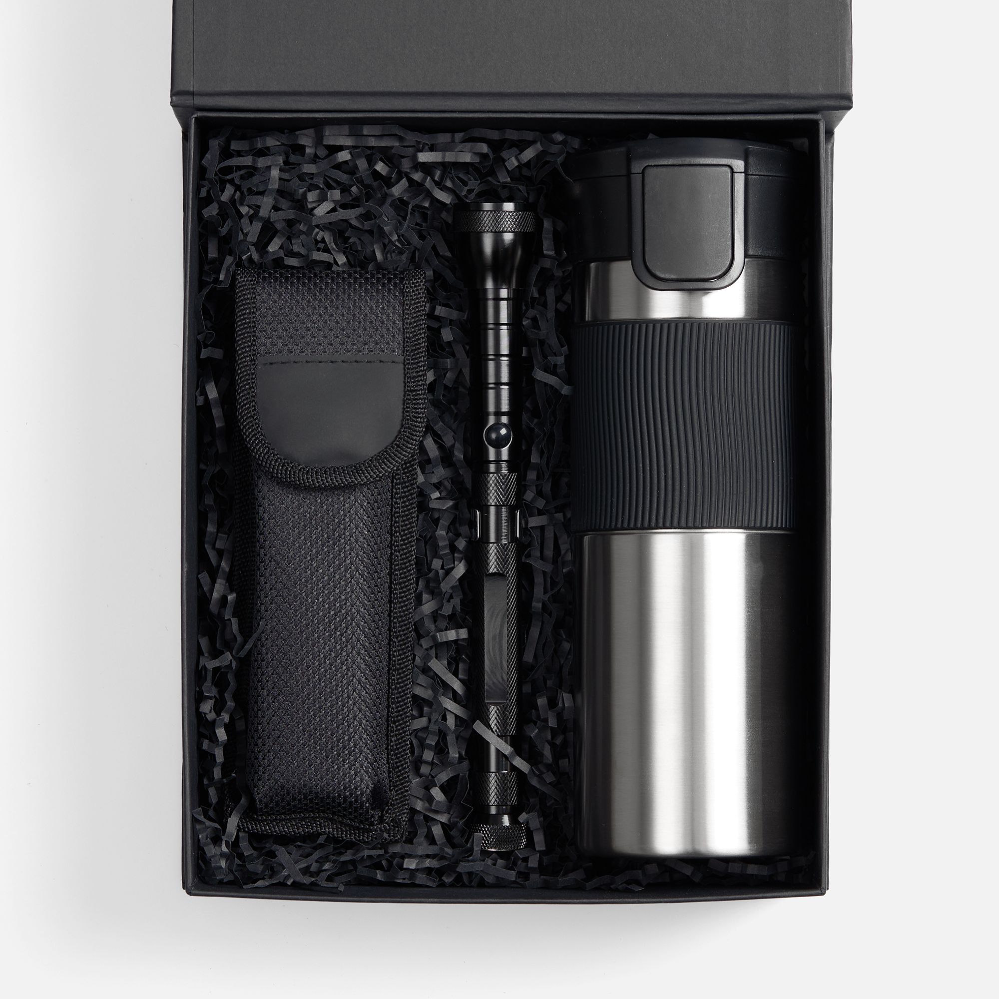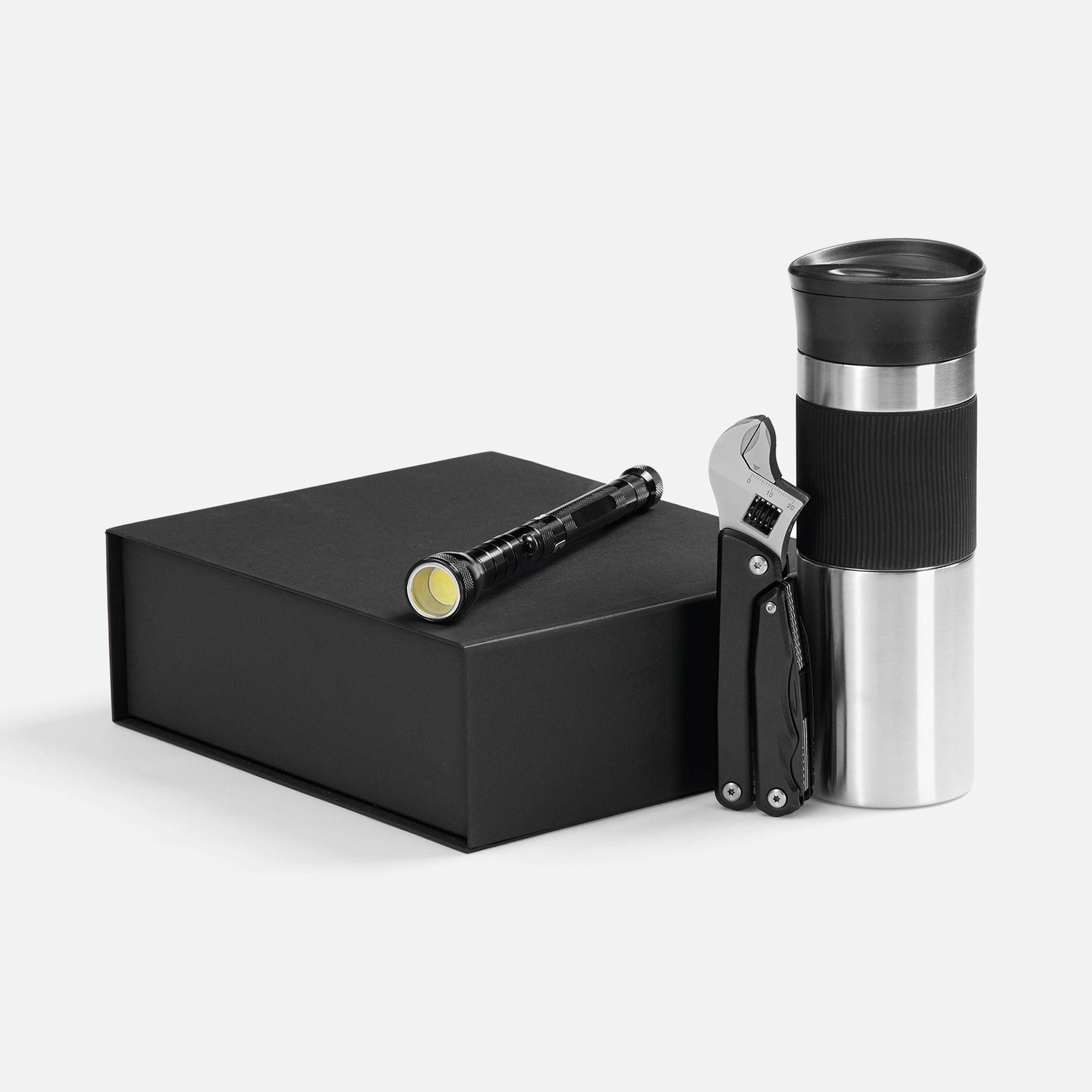 Материал: мультитул - нержавеющая сталь; алюминий; термостакан - нержавеющая сталь; фонарь - алюминий, металл; коробка - переплетный картон, бумага Malmero.